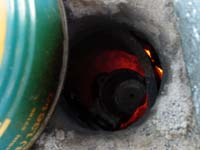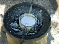 Use only enough blast to get the crucible dull red hot. Too much air will eat your crucible like a cutting torch, and then your aluminum will leak into the fire. Did you know that aluminum burns with a terrifyingly hot, greenish flame, and deposits greenish oxide all over? This makes sense if you remember that aluminum powder is what makes thermite burn so hot. Try to avoid experiencing that firsthand. If you are getting the crucible only to dull red, you probably have a carburizing atmosphere in there, and little to worry about. Orange it too hot for aluminum, and risks an oxidizing fire unless you break your charcoal rather small. Here you see the crucible at temperature with an unmelted piece of aluminum in it.