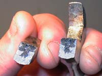 Speaking of charcoal, another problem is clinker. Charcoal briquettes are cheap and convenient because it is easy to break them in half by tapping on the end with a hammer. This is a nice size for this kind of furnace. But briquettes have coal dust in them, so they will form clinker, which is a nasty mass of glassy, black leftover junk. We don’t notice this in a barbecue grill, but you go through fuel a lot faster with blast. If you find yourself adding more and more blast to maintain the same heat, you probably have a layer of clinker blocking your air. Lump charcoal costs a lot more and takes more effort to break to the right sizes. But it is probably worth it if you’re not doing a lot of this. Wood doesn’t make clinker! However this becomes more of an issue when you burn all day and run through a few backs of charcoal to make ingots. This project took less than a bag, which wasn’t enough to build up clinker with name-brand briquettes. But the cheap stuff would have because it has more coal and less wood.
