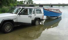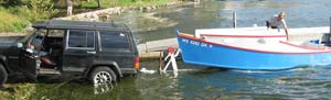 OK, that one is a worst-case scenario. The water levels were high, so we were stuck using the top of the ramp, which has less slope. But here’s the same ramp, trailer and same model Jeep with more normal water levels. Even here we’re dragging the boat off because it’s not quite floating yet.