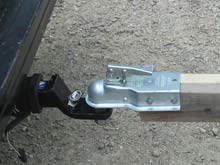 Then I close the coupler and add a couple bolts to the rear of the extension. The extension’s aft legs sandwich the trailer’s tongue and a bolt pins it in place top and bottom. Notice how this lifts the front of the trailer for a slight tilt bed effect. This can be helpful in shallow ramp situations. It certainly doesn’t hurt.