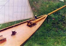Hugh’s model was built upside down with the planks glued to the keel, stem and transom and he found cedar an idea timber. The model was finished with varnished upper hull and decks and is an absolute delight to sail.
