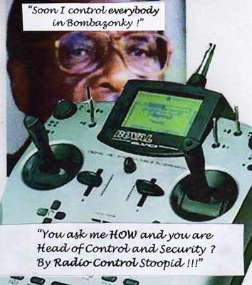 Heard on the Wireless, that a bespectacled African dictator is to implant microchips in every Zimbabwe Citizen’s brain and then control them using model yachting style transmitters with same frequency crystals. He got the idea while sailing an RC coconut husk boat in the private pool of his `palace’ in Harare. His protective thugs are also to be implanted with receiver chips in their brains (eh???) so that he can control them.