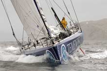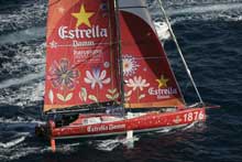 In another photo by Chris Cameron, Temenos II is seen leaving Wellington after a pit stop on Day55 when lying third 2,639 nautical miles from the leading boat. while in the last photo is seen one of the eventual retirees, the Spanish boat Estrella Damm sponsored by the brewery of that name and certainly one of the most attractive and colourful boats in the fleet of nine that started.
