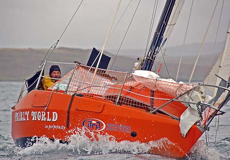 I had done an article on him when he lived on a houseboat on the Thames in England, and I have since thrice read his very entertaining book Swirly World. The 18’ boat, full name Swirly World in Perpetuity in appearance was a miniature ocean-going keeler with a flush deck and a one man cockpit someone told him about and he found floating bow down in Auckland’s Little Shoal Bay. When he was twelve he had owned and raced a P Class boat called Tin Ribs, and if my memory serves me right, I read somewhere that in it he once beat Russell Coutts, and I mean `the one and only one of America’s Cup acclaim!’  A real voyager at heart, aboard the once pea green in colour Swirly World, Andrew made a quick 1,400 mile sail to Sunday Island and back and also sailed her from New Plymouth in New Zealand to Queensland, Australia where as the smallest boat he lined up for an ocean race back to his homeland. All of this is documented in his book written about in a previous column on Duckworks (and I believe still available)