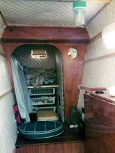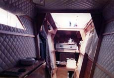 Starboard hull looking aft towards the “pantry”. Watch the water container at the right. A nifty construction. The could be folded when empty. We have had provisions to hang them up and have had“running water”. But I never found them again.