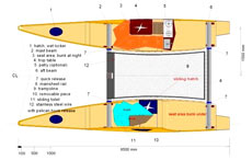The top view shows a possible lay out. The “Butterfly” was 84 cm wide, the KD 650 is 92 cm wide. This 8 cm makes a big difference. It is now possible to have a L-shaped seating arrangement. See next picture . The port hull sleeps 2 and has a toilet under one of the bunks. The starboard hull has a seating area with a folding table and a small pantry with cooker and sink. The seat area can be converted to an other bunk. By the way, the pantry is an option, I personal prefer to cook on deck. The wet lockers can be used for ropes, the anchor and other deck gear not in use. Under the bunks are huge storage areas. The compartments under the wet locker and the aft bunk under the wet locker and the aft bunk respectable the lower area under behind the pantry make the boat unsinkable.