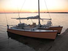 He's been sailing the Gulf of Mexico for over 30 years, in a variety of boats, starting with DoubleDare, a 27 foot catamaran designed by James Wharram. Though he subsequently owned a series of monohulls, Doubledare remained his favorite, until he designed and built his little trailerable cruising catamaran. Slider has now become his all-time favorite, with her ergonomically correct seating inside the hulls, her stability, and her handiness. She was built to demonstrate the comfort and safety advantages of small open catamarans; there are no similar designs available. She was named after the red-eared slider, "a deceptively fast aquatic turtle."