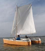 Her shallow draft and flat bottoms make her easy to beach and to trail on a simple home-built trailer. Her mast can be raised or lowered in moments, because her forestay is tensioned with a zero-stretch Dyneema lanyard led back to the forebeam.