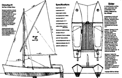 Slider’s been sailing now for nine months, and I’m convinced she’s pretty special. Whenever I’ve taken anyone out, the reaction has been uniformly enthusiastic. The boat is handy, goes well to windward, has a lively turn of speed, and above all, is unbelievably comfortable, for a 16 foot boat. She’s remarkably dry in a seaway, the seats are luxurious, visibility is perfect, and steering is easy. She tacks effortlessly, unlike many catamarans. She’s sturdy too; we’ve rammed docks and chipped the paint a little, and once we hit a sandbar with the daggerboard down, doing six knots, and neither case nor board was damaged.