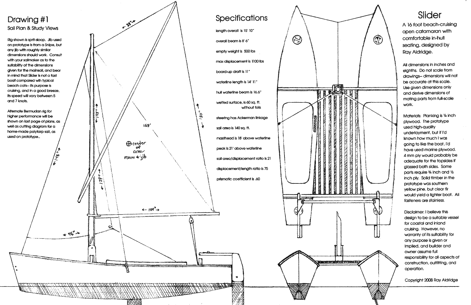 When I first thought about building Slider, the idea of selling plans seemed a little goofy to me. The reactions I’d gotten to my idea, from friends and in the various online boat-design forums were dubious at best, and among those critical reactions was one that struck me as possibly accurate: “Okay, so if, as you claim, a little cat with in-hull seating would be so easy to design, why hasn’t a real designer done it? Maybe it’s harder than it looks.”