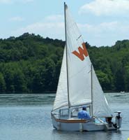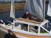 After sorting out the stuck, swing -down, off-center-board as well as the lee helm (see letter of .Oct 07’- Dec. DW) , I had about eight more sails that first year.  As I wrote then to Chuck: I cut it out and built a daggerboard .. roughly 2' x 3&1/2 ', same area. Doing so moved the center of resistance forward 6". Voila! a bit of weather helm .. light in light air, a bit more with a breeze ... just right.”  Being able to tow up to the lake and sail with ease, keeping pace with a Potter 15, was a great confirmation of the concept.  I haven’t any pictures from that period, but here are a couple in light air this past summer, at Lake Nockamixon, a sailing hot spot an hour north of Philly.  There have been no changes to her rig or looks since, although I did add a 4“ bridge deck behind the cabin bulk head.  There‘s a pulley and clam cleat for the main; she’s so steady that it’s entirely safe under 10 kts.  It’s also cot two cup holders on either side and a 4” lip off the floor below which make a handy stowage for little things.