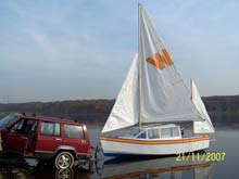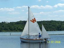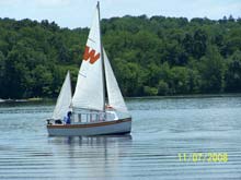 Many Ducker’s responded to my design, build & launch articles two years ago, often with helpful advice.  At the time  several folks asked for a “full performance report”.  I never got around to it … too busy sailing.  But now it’s New Years 09’ and cold and blustery here in Philadelphia.   Over two seasons I’ve had a couple dozen outings under widely varied conditions.  Maybe now is the time to sum it up.  My Wanderer design, hull #001, the “Terry Jeanne”, is sound and able: points up well, moves smoothly with a wisp of wind and is wonderfully steady in all conditions, moves easily at hull speed under 2/3 power, carries 4 - 5 - even 6 in comfort, and provides comfortable bunks for two..
