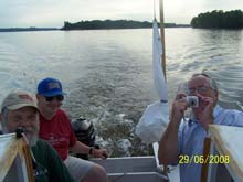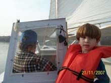 Happily, that first season extended well into Winter.  Next are a couple of pictures from Thanksgiving week 07’ when my son was in from Oakland, CA.  It was a beautiful, but calm day and a special pleasure to have my son, his son, and an old friend of his aboard.  (You know you’re “old” yourself when your 44 year old son has an ‘old friend’.)  This was the first time I was able sit in the cabin myself and appreciate the full headroom and panoramic view out all those windows. This is Lake Galena - Peace Valley Park, Bucks County, barely a half hour from home, a major lay-over for thousands of geese and ducks.  There was just a wisp of air moving and we ghosted along for nearly an hour until it became still.  The little electric trolling motor then got us in at maybe 3 knots on glass-like water at full power; 2 knots at ½ power.  In light air the MinnKota and a large rudder provide ample control.  A memorable day both for having the boys aboard, and for Nature’s exquisite beauty.