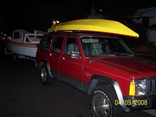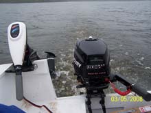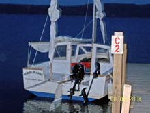 I contented myself with Duckworks reports, following the EC Challenge and chewing the fat with Steve through last Winter.  The boat was covered with snow and ice several times with no apparent harm. The caps are off the compartments for circulation.  The upgrade priority was to get a motor since in a breeze it was sometimes tricky getting in.  And it would open up calm days and other waters; maybe some fishing outings too. The whole project was on a tight budget; using plastic was ruled out.   I had saved up, and in May I bought a 07’ 3&½  Merc 4-stroke via Craig‘s List; nearly new, for $550.  My total expenditure came to just under $2,000 over a year and a half -  $900 or so on wood, epoxy, etc  .. 500 on the trailer  .. and the motor.  My first outing this past Spring (08’) was a motor only trip to the north end of Nockamixon, varying the power often to begin to break it in.  It’s at least eight miles long, plus a north inlet that’s more creek than lake that runs another couple miles too narrow to sail.   I hadn’t had a motor since a pre-WWII 1&½  on a little pram in the mis-50’s.  I wanted something that would protect the environment and allow me to get on to lakes with strict restrictions.  The motor starts easily and put-puts along nicely at maybe 3 knots, just sipping gas at 1/3 throttle, opening lots more opportunities.
