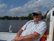 In early July Steve B. and I launched on the Rancocas and went down the river to the same place for lunch.  It was piping up at 10 - 12 and a couple of tacks had us at the buoy out from Dredge Harbor so we dropped the main and loosed the jib and mizzen to motor up the narrow winding channel for lunch at the Marina.  By the time we ate and puttered out to the Delaware again it was blowing .. 13 - 17, with gusts to 20 or more.  With the two of us aboard she just grabbed all that power and bit into the 1 - 1&½ sea.  What a ball !  She will heel a bit, and we gave in and both sat to windward; but then she just steadies and goes.  I gave Steve the tiller, and for the first time we took a bit of spray on the windows and even in to the cockpit.  After a couple of tacks up-wind, down-river we headed north on a long rolling run, steering to keep her wing-on-wing and using that broad transom to push her past hull speed now and again. Wish we had had a gps.  Steve tells me “she a had a bone in her teeth” and indeed, she handles well on all points of sail, never thinking about going over but finally giving us a bit of a thrill.  That mast is un-stayed, by the way, resting in a box on the bottom and up through a slot in the roof - the forward bulk head is heavily reinforced.  This is no problem … but that two-piece aluminum mast does bend over a good foot at the tip, spoiling the sail shape up there and de-powering her a bit.  I’m going to add the side shrouds this Spring.