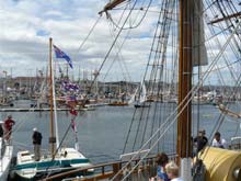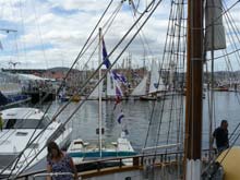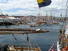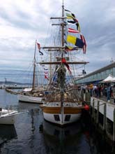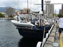 This was the first Hobart Festival that I had attended and its sheer size was almost overwhelming.  First stop at the Elizabeth Street Pier was the Lady Nelson, the Tasmanian sail training vessel which was built as a bicentennial project in 1987-88 to re-create the 18th C brig of the same name.  The original Lady Nelson was used in the first European settlement of Tasmania at Risdon Cove on the eastern shore of the Derwent River, and only a few kilometres away from the present city of Hobart.  (See the Lady Nelson Web Site for more information about the replica and the original: https://www.ladynelson.org.au/corframe.htm)