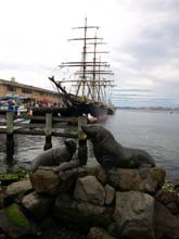 Sail training ships were in abundance: The biggest of these was the Sydney Heritage Fleet’s James Craig, which sailed down from New South Wales with a crew of paying passengers.  I was just able to catch a photo of a double kayak under her bow, but missed the figurehead and ship’s name in the frame.