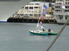 A Wharram Tiki 21 motors around Sullivan's Cove with a Japenese cruise ship and the Anzac Frigate Stuart in the background