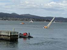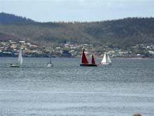 A Norwalk Islands Sharpie sailing on the Derwent. The far shore is still recovering from a bush fire a couple of years ago.