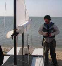I had gotten ahead of everyone else so I stopped to replace the batteries in my GPS and to wait on everyone else to get there. The other ‘ducks joined me on the beach to do some minor maintenance and repairs on the boats. Shortly afterward the blue Bolger Cartopper that had been dismasted, capsized, and lost her sails was dropped off on the Island with us. Andrew Linn decided to see if there was anything we could do for him. Kevin had a spare lug-rig sail with him and Gordon had a spare spar that could be modified into a mast. While Andy fitted the parts to the Cartopper (using an axe to shave down the base of the spar to fit into the mast step and partner) David R landed his Hobie-14 and told us that he’d seen Bryan’s RAID-41 floating upside-down with no sign of the skipper. My spirit was leaded on learning this and I attempted to raise the Caprice on my hand-held (even on 5W it was too weak to establish contact) and failing that sent a mayday on ch.16 to alert the coastguard that one of our sailors may be in serious trouble and to start SAR. David relayed the coordinates off of his chart to the last known point the vessel was at. After getting the cartopper going again and finishing up our own repairs, we set out for the bridge. As we approached our landing-site I finally heard from Sandra on the Caprice that Bryan was on their boat and that they were trying to track down his errant vessel. With a bit of additional work I got the Coast Guard to contact Caprice and I understand ship and skipper were ultimately reunited (though I understand there was some trouble with the salvage vessel that the Coasties had called in, sorry about that). It was quite a relief to find out that he was okay, most of the times when a boat is found with no one around it the story never ends well.