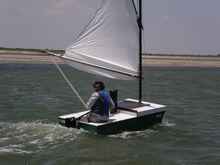 With the boat’s completion delayed due to weather (without a workshop I’m forced to work out doors) I did not get a chance to get much testing and sailing time on the hull. Heck, both times I went out on her was with the sails jury-rigged (though she sailed nicely so I figured it would only get better with proper rigging). The knockdown and recovery testing was promising. She rolled until the rail touched the water and she stiffened up, continuing to slowly roll from there until she was at about 80 degrees or so before plopping over. On dumping me from the cockpit, she floated easily in about 3 inches of water and resting on her hollow mast easily. She wasn’t all that stable on her side either, a gentle tug on the daggerboard sent her upright with a fair amount of force.