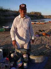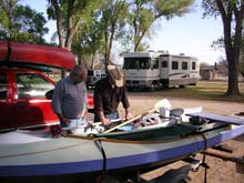 | The first night we spent at the Castolon campground. Unfortunately, floods earlier in the year had wiped out half the campsites. So our group had to double up. Skip's unusual boat draws a lot of attention - here a total stranger walked up and examined it closely. Of course Skip was not shy about showing it off. |
