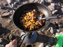 We made camp around mid-afternoon. Since I don't often get a chance to cook, I took this picture to show Sandra that I did not just eat everything cold. It is a skillet stew made from a Spam single with canned corn and freeze-dried beans - mmmmm. |