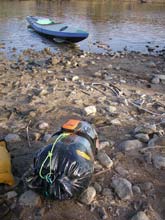 | Packing up the next morning. Paddlers know about dry bags - heavy plastic duffle bags that keep the water out of your gear. This one is clear which makes it much easier to see what is inside. On top of it is my new Spot satellite locator. I send several "I'm Ok" messages each day for the benefit of those who could not come but wanted to check on our progress. Click HERE for a Google Earth file that shows our route. |