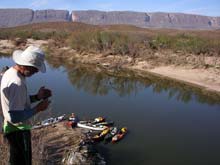 | It is a day's drive from our place to Big Bend so Skip arrived the afternoon before with his spanking new foam cored, kevlar and fiberglass canoe. The next morning we drove to the Rio Grande. |