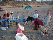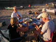 | Time to eat! Louis, John, Dana and Linda had organized into a food group and they cooked and ate together. They really put on the dog too! It is amazing that they can carry all that gear and food in their boats. |
