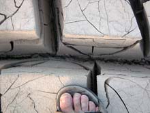 | Another after dinner walk revealed some of the biggest mud cracks I have ever seen - over a foot deep! Another legacy of the recent floods. Don't look at my foot - I warned you that some of us were getting dirty. |