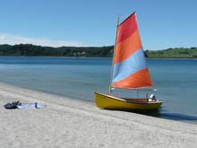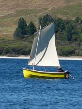 Onto to Trade-Me (NZ equivalent of E-bay) I went, and found the mast and sail from a 13 ft ‘Seabird’ sailing dinghy – a fibreglass ‘clinker’ replica, hull design. It had a 2 piece mast, a bit under 6m (19ft), with a Bermudan, loose-footed, multi-coloured sail, a reasonable mainsheet and 2x good blocks attached. This was a more manageable arrangement. It sailed quite well and was much more predictable than the phoenix design, but I hated the 5 coloured sail.