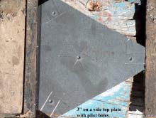 The equilateral triangular anchor top was made from 1/4" plate, finished size 3" on a side and the trimmed top is shown below. One quarter inch pilot holes were drilled at the base of each notch section, which receives a fluke, and the center were the anchor shank passes through.