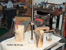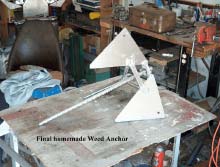 The above jig allowed each fluke to be positioned properly and squared. Braces were made from 1" strap 7" long with 1" ends bent 30 degs. Each brace was held in position with clamps hen each piece was tack welded, then final welded, when all were in their true position. The final anchor is shown.