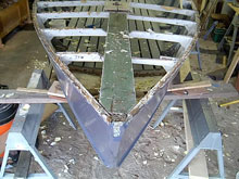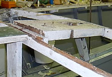 Additionally, this plank had been let into the beams—in other words the beams were cut away to allow the ¾” plank to lie fully beneath the plywood. This had the net result of reducing the load bearing section of the beams from 1 and 3/8” to 5/8”—more than half the beam. In actuality the beams had even been over cut and ¼” shims placed between the plank and beam. Needless to say all beams had suffered breaks while weakness in the bows due to omission of the breast hook (the plank was toed in to a block screwed to the stem with nothing tying to the hull) was evident from numerous repairs to the stem.