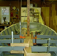 In the accompanying pictures a small electric space heater can be seen. It is my practice when working through New England winters to tent over the boat after setting epoxy joints and run this heater inside the boat. I tent as small an area as possible and run the heat to maintain about 60 degrees at the epoxy. This allows the epoxy to be fully kicked by morning.