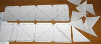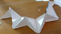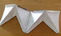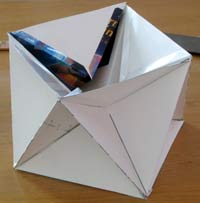 5 - Now bend the side-tabs on the lower edge of the accordion strip back out and tape the small triangles—each to two of the tabs. Then flip it over and tape in the other 4 triangles. If this has all worked according to plan, you will now have 8 corner cubes with each one facing out 45 degrees around from the previous one. |