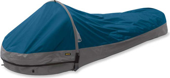 The Alpine Bivy is a one-person shelter with a breathable Gore-Tex upper piece and water-proof nylon bottom. A collapsible pole inserted in to the upper piece forms an arch that raises the fabric about 20 inches, creating some overhead space for the head and shoulder area. Access to the bivy is through a zippered area at the head/shoulders. That opening can be zipped closed with a Gore-Tex cover to make a weather proof shelter, left wide open for fresh air, or - better yet - zipped closed with mosquito netting.