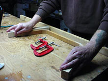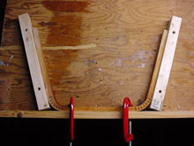 View showing the jig. The clamping board is a 1x4 screwed to the edge of the bench sticking up 1 ½". The jig sides are 2"x2" stock screwed at a 17 deg. angle. The left side is permanent and the right side is the one I adjust for each rib. I let the ribs stay for a few minutes in the jig and tie a cord across the tips to hold the shape until they are dry. I leave them a little long for final trimming and cut the ½" dia. x 1" long tenon on the ends.