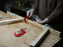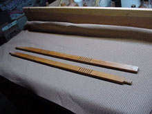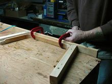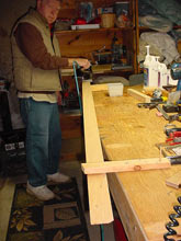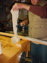 I noticed that some of the stock that I re-sawed for the gunnels was drying with a bow to it. Two of the four pieces (I’m splicing them in the middle) were OK and the other two bowed in the wrong direction. We decided to try the wet sock and iron method to straighten them out. I prestressed them with a crude set-up as shown in the photos Truing Gunnels 1-4. One end is slipped under a shelf, the center is bowed up with a 2x4 and the other end is held under a 1x2 screwed to the bench. You can adjust the stress by increasing the size and location of the 2x4.