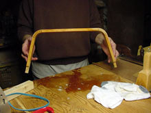 Thick wet cotton socks wrapped around the kerfs after soaking overnight.