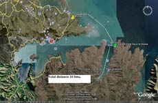 The outbound leg started in 20 knot conditions which moderated to 15 knots late in the day. It was here that I really began to question the concept of sailing as a way of going somewhere without resorting to fossil fuels! The only way out of the harbour was close hauled and my progress to windward was pitiful. I have noticed that in calm water Philsboat's performance is reasonable, but in the rough chop my progress to windward was poor. In an effort to make some headway, I let OUT a reef. The boat ended up with water over it's wales several times, but simply letting the sail out was enough to right it. Paradoxically, sailing Philsboat at high angles of heel, gives you a much better view, since you end up looking out of the slot rather than through the salt sprayed windows!