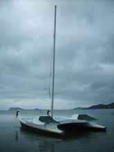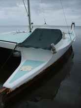 We built her from two asymmetrical fiberglass Piver trimaran amas I had been given. The entire boat was dreamed up as we went along - one idea at a time - a great experience. Those were fun days, thinking up what to do, sailing a little model to test our theories and putting it all together. We used plywood to add bulkheads and height to the gunnels, and built the decks and topsides. The little canvas cockpit covers he is using are to keep the rain out - after all the windward side is wet! I can see the cockpits must be rather full of water anyway from the way the stern has settled. She has a 12' beam and nice sleeping/sitting room in the little cabins. The forward hatch is for storage in the forehull.
