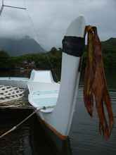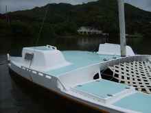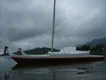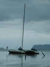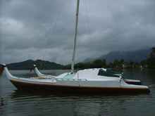 She sailed beautifully (at least I thought so), no board at all, and steered fairly close to the wind and was quite fast. We broke a mast once pushing her as hard as we could as we sailed close in up and down the shore in the advance winds from an approaching cyclone. That was exciting. The surface of the bay was nothing but froth from the blowing spray. We had to stand on the deck because the blowing water stung our bare legs so badly we couldn't sit down. Barrels and junk, even a live chicken, swept past us from the shore out to sea bouncing along the surface carried by the huge winds.