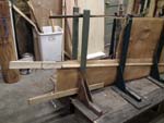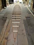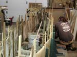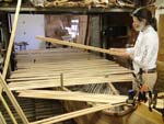 Day 7- Half day, cleaned up the shop and put into 2 foot panels which make sides of canoe.  There are 13 panels on each side, a 26 foot canoe.  The panels are held in place by faring sticks, stakes, and wood clamps.