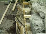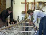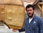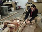John cutting gores in the bark. Note the rocks on the frame on top of the bark.