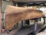 How the ribs are laid on top of sheathing and beveled underneath inwale.  The gunwale cap is visible as well.