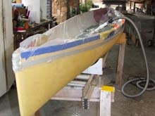 Took boat out in the yard and sanded hull. Cut out major voids and fit pieces of Kevlar felt in voids. Epoxy coated hull and covered Kevlar patches with 4 oz glass and peel ply.