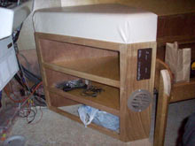 Lower helm seat with shelves for underwater camera, Xbox, boat manual, and propane shut off valve |
