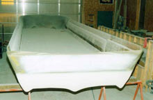 We stripped it down to bare glass, ground and glassed new stringers, floor supports and transom to handle the new outboards, previously had I/O. Power was decided to be two Yamaha high thrust T-60 four strokes. The boat was originally rated for 250 hp but it’s a houseboat not a ski boat. For the floor we used ½”marine ply., then 1” holes were drilled every foot and filled with USCG app. foam from hull to floor then encapsulated in glass.